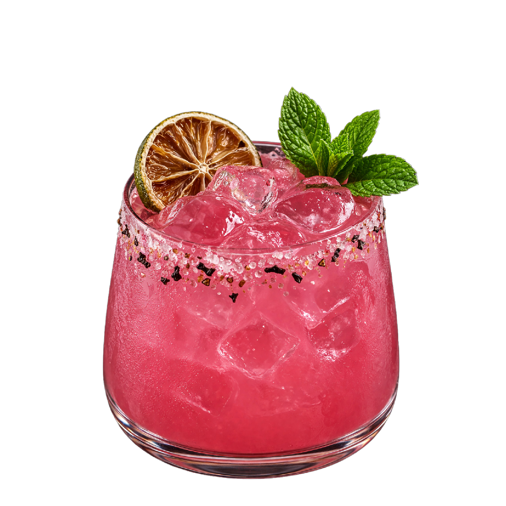 Tequila, Triple Sec, Hibiscus Tea, Lime Juice, Cream of Coconut, Lime and Mint Garnish.